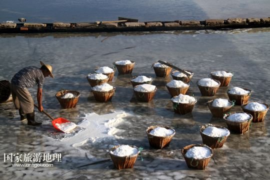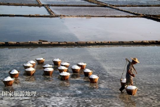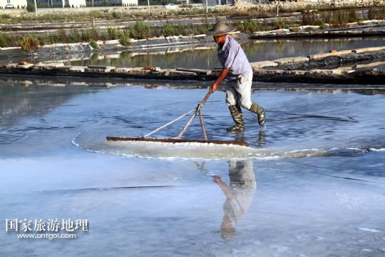 國家旅游地理 浙江臺(tái)州8月10日訊 8月10日,在浙江溫嶺市石塘鎮(zhèn)蒼岙鹽場,一名鹽工頂著太陽在鹽田里把曬好的鹽收集起來挑到鹽堆去。連日來,浙江省溫嶺市石塘鎮(zhèn)蒼岙鹽場的鹽工利用晴熱天氣忙著曬鹽。對于浙江的曬鹽人來說,夏季陽光最猛烈的7月、8月、9月這三個(gè)月是他們勞作的黃金季節(jié)。天氣越炎熱,光照越猛烈,曬鹽效果就越好。炎熱的夏天艷陽高照,而曬鹽人卻要頂著高溫出門勞作。 /新華社發(fā)(梁敏慧 攝)