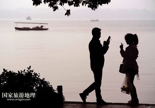 國家旅游地理 浙江杭州11月5日訊 11月4日,一對男女青年在西湖邊拍照留影。生活在杭州的人是幸福的,因為杭州有西湖。清晨的西湖,恬靜,淡雅,柔美,朦朧。岸邊,堤上,健身鍛煉的市民、散步賞景的游人,在湖水、小橋、亭閣、石欄的襯伴下,構(gòu)成了一幅幅剪影效果的水墨圖畫。 /新華社記者王頌攝
