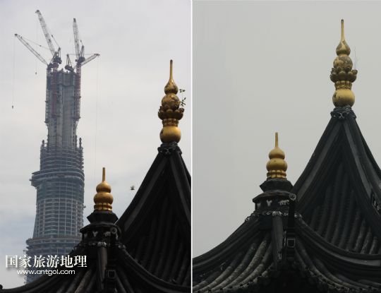 國家旅游地理 上海12月26日訊 這張拼版照片顯示的是:2013年8月3日在上海豫園拍攝的在建中的上海中心(左圖);12月26日在同一地點拍攝的上海中心“消失”在霧霾中(右圖)。當日,上海遭遇霧霾天氣,空氣重度污染。 /新華社發(fā)(賴鑫琳 攝)