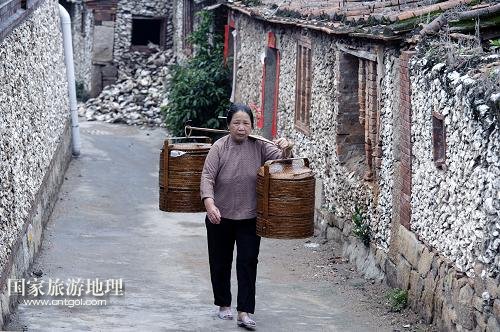 5月11日,在福建泉州豐澤區(qū)東海街道蟳埔社區(qū),一位蟳埔女挑著擔(dān)子走在村道上,村道兩旁是古老的蠔殼厝。宋元時期,這里是泉州“海上絲綢之路”的重要港口,遠洋航船載著絲綢、茶葉、瓷器等貨物運往世界各地,返程時壓船的海蠣殼成了村民們的建筑材料。