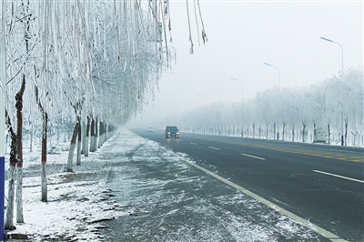 12月23日,銀川永寧快速通道兩旁呈現(xiàn)“霧凇”美景。據(jù)了解,霧凇俗稱樹掛,是一種冰雪美景。它是由于霧中無數(shù)零攝氏度以下而尚未結冰的霧滴隨風在樹枝等物上不斷積聚凍粘的結果。霧凇現(xiàn)象在我國北方是很普遍的。記者 吳春霖 攝