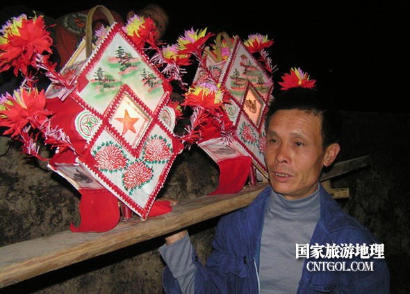 中年村民肩抬慶燈準(zhǔn)備去接“龍”。鄒善水 攝