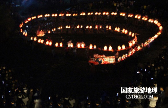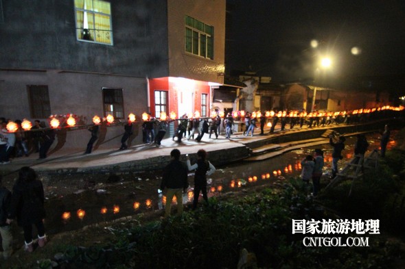 2月18日入夜,春雨霏霏。在光裕堂祖祠祭龍頭畢,鄒姓村民紛紛肩抬慶燈到祖祠接成220多米長(zhǎng)的“龍”身。三聲銃響,游龍時(shí)而在村間慢悠游弋,時(shí)而在村道滯拔狂走,火紅的燭光伴著霏霏春雨,讓慶燈“龍”絢麗多姿,展示了“紙包火”的奇跡。 游“龍”所經(jīng)之處,鞭炮和禮花聲不絕于耳,祈求五谷豐登、吉祥如意。街巷人山人海,熱鬧非凡,一派花燈游龍慶豐收狂歡鬧元宵盛況。 吸引了海內(nèi)外游客及四鄰八鄉(xiāng)的萬余群眾紛紛前往觀看。